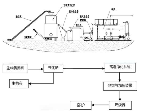 生物質(zhì)原料通過螺旋加料機加入氣化爐,而氣化所需要的空氣通過鼓風機從氣化爐底部的配風裝置進入氣化爐內(nèi),生物質(zhì)原料在缺氧狀態(tài)下燃燒生成可燃氣體和焦油,部分焦油在高溫下發(fā)生二次裂解為不凝性可燃氣體。熱分解析出的焦碳與燃燒產(chǎn)生的水蒸汽和二氧化碳進行還原反應,產(chǎn)生氫氣、一氧化碳等可燃氣體,在氣體上升過程中,繼續(xù)進行還原和熱解反應。氣態(tài)焦油、氣體連同灰渣顆粒、焦碳從氣化爐上部流出,進入隨后的燃氣凈化分離裝置旋風除塵器,進入旋風除塵器絕大部分灰渣通過旋風除塵器從燃氣中分離出來?;以ㄟ^除灰裝置、灰輸送裝置輸送到合適的地點。旋風除塵器分離出來的燃氣進入燃氣加壓裝置,被壓送到鍋爐燃燒機完全燃燒。
